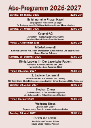 Mit unserem Abo-Programm erleben Sie Theater in seiner schönsten Form – regelmäßig, entspannt und immer mit dem guten Gefühl, Teil von etwas Besonderem zu sein. Ein Abo sichert Ihnen nicht nur beste Plätze und attraktive Preisvorteile, sondern auch den direkten Zugang zu den Highlights unserer aktuellen Spielzeit.